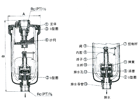 本產(chǎn)品安裝在自動排水器,空氣過濾器,空氣過濾減壓閥的水杯底部,能自動排放積聚在水杯中的冷凝水。注意事項:垂直安裝,排水口朝下。